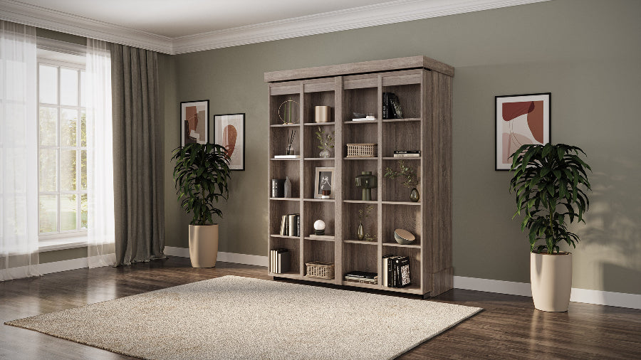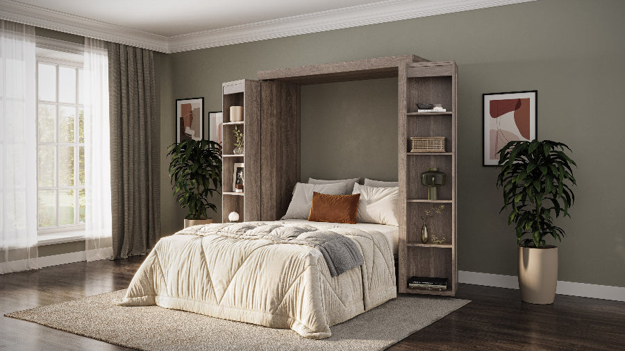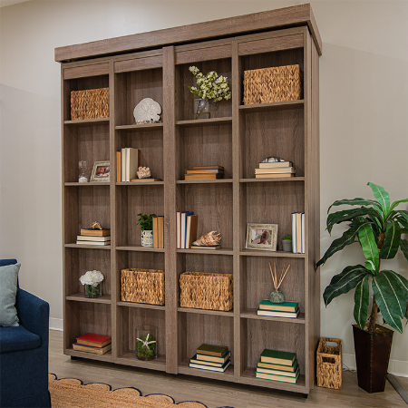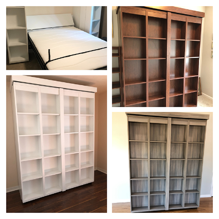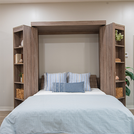 Our Boaz Bifold Bookcase Murphy Bed System is the most compact Murphy Bed with cabinets in front of the bed. You do NOT have to empty the shelves to open this amazing wall bed!